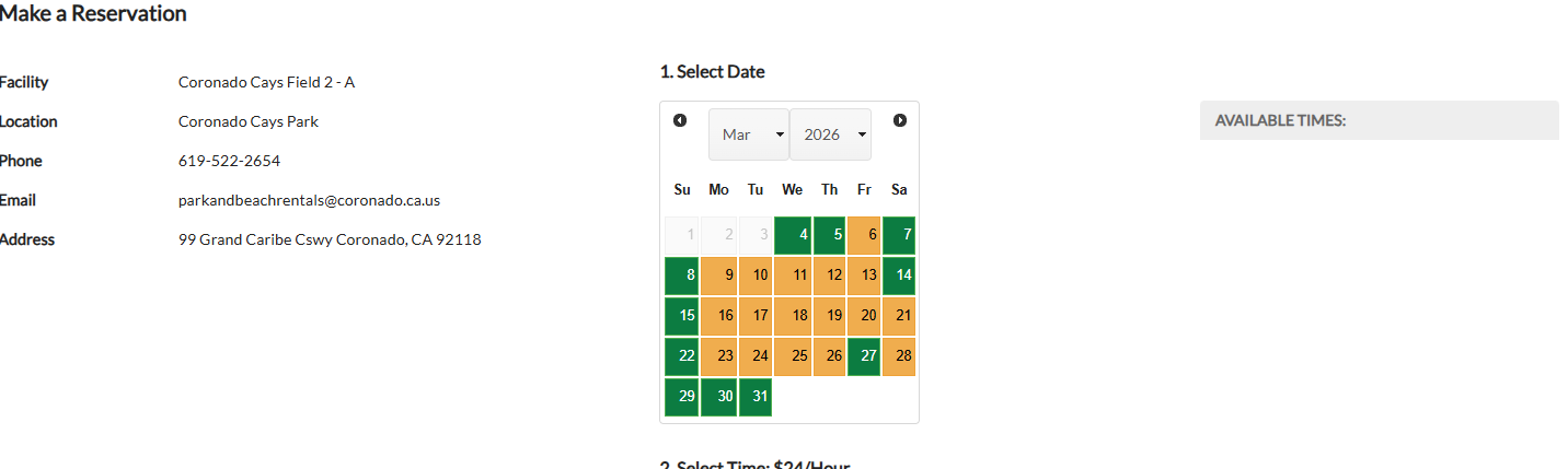 Below you can see that Coronado Cays park currently doesn’t have any scheduled events for March 14th. A green date on the calendar indicates the field is open for permitting.